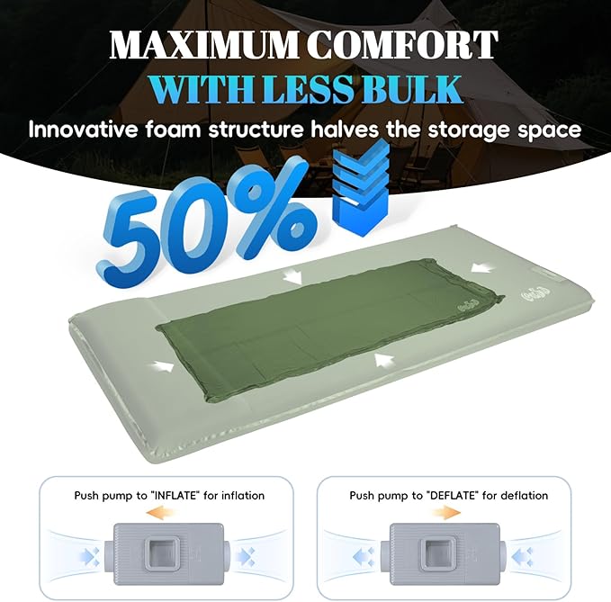 - 【HI-TECH MEMORY FOAM CAMPING MATTRESS】This automatic inflatable sleeping pad with a pillow features a high-tech memory foam design and is suitable for various sleeping positions. Whether sleeping on the back, on the side or on the stomach, it can fit the body curves very well. The inflatable mattress not only remains soft but also has support, bringing a comfortable sleep experience to the travel.