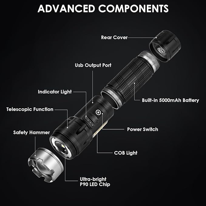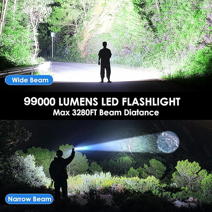 - 🔦 99,000 Lumens Rechargeable Flashlights: With upgraded P90 LED Chip, our flashlights high lumens illuminate your surroundings with an impressive 99,000 lumens of output and a max light distance with 3280ft. Whether you're camping, hiking, or other outdoor activities, our flashlight rechargeable will provide the reliable lighting you need.