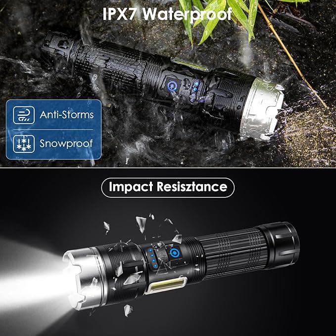 - 🔦IPX7 Waterproof : Made from aircraft-grade aluminum alloy, the led flashlights high lumens is built to withstand tough conditions. With IPX7 waterproof, this LED flashlight rechargeable is suitable for outdoor fishing, running, cycling, camping.
