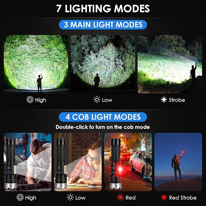 - 🔦7 Lighting Modes and Adjustable Light Head: 7 different lighting modes to meet your various needs. Whether it is the main lighting of high, low and strobe mode, or the COB lighting of high, low, red and red strobe mode, our super bright flashlight can meet your needs. Move the light head up and down to get a narrow beam and wide beam to meet different usage needs.