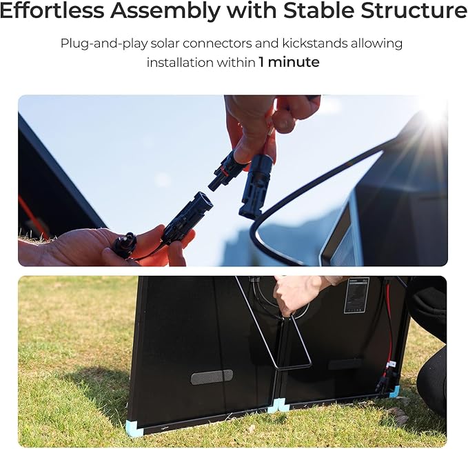 - [1-Minute Setup] No tools needed! Unfold, prop up the rust-proof kickstands, and get power in 60 seconds. IP68 connectors work with most portable power stations and batteries.