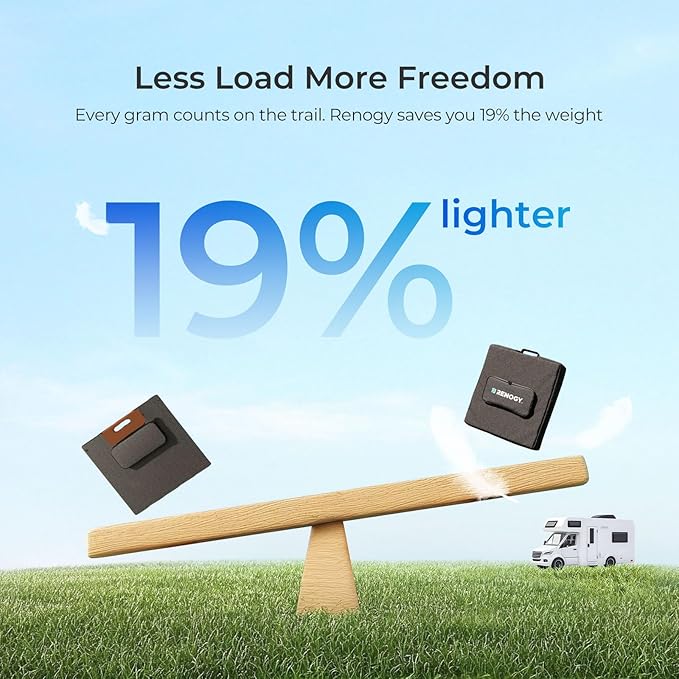 - [Lightweight & Foldable] At just 8.86 lbs (19% lighter than standard portable solar panel) and folding to 20.6''x24.6''x1.6'' in space-saving design. Perfect for camping, RV trips, or emergency backup. The Renogy solar panels deliver 320Wh daily (sunlight-dependent) and fold easily for storage or transport. Take reliable solar power anywhere!
