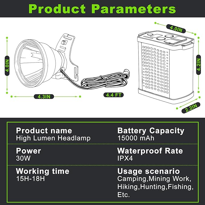 - 🔌Massive 15000mAh Battery – Up to 18 Hours of Runtime:Powered by a built-in 15000mAh rechargeable battery, this high-performance headlamp delivers extended lighting for up to 18 hours on a single charge. Whether you're on an overnight hike, night fishing trip, or working a full shift in the dark, you can count on long-lasting, reliable illumination without needing frequent recharges. Perfect for those who need dependable power in critical moments.
