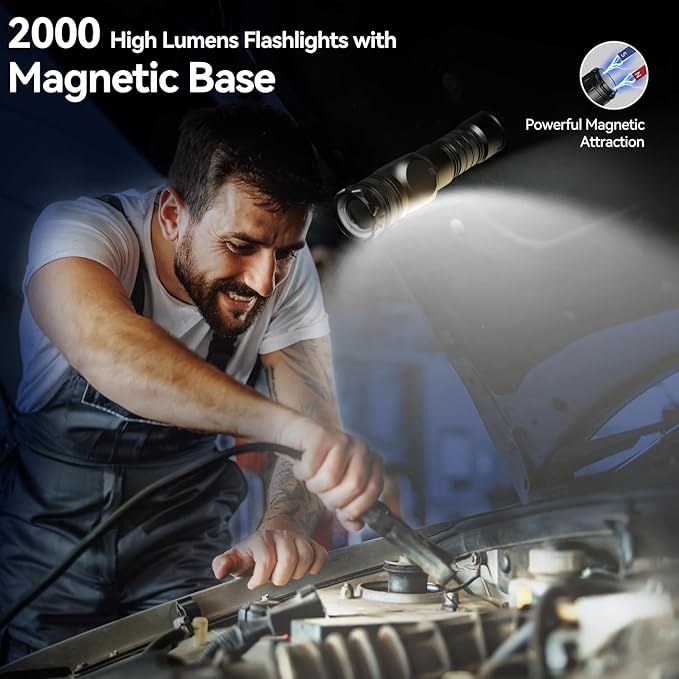 - [Magnetic Base and Heavy Duty Flashlight] This powerful flashlight is made of high-strength aluminum and features a sturdy and drop-resistant structure. Even if it accidentally falls on rugged terrain or is run over by a car,it can still keep working. Equipped with a powerful magnetic base, it attaches securely to metal surfaces across diverse conditions,freeing up your hands. It's very compact and comes with a Flashlight Carrying Sleeve, making it easy for you to carry around