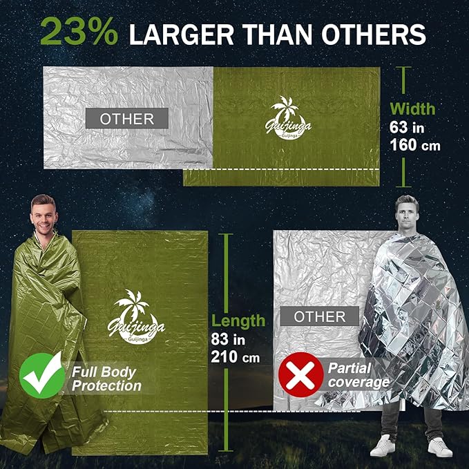 - 【EXTRA LARGE & EXTRA THICK】: Each blanket measures 83" x 63", 23% larger than other emergency blankets, and is made of 26-micron PE material, 2x thicker than other emergency blanket for car, providing full body protection, making it a great addition to any survival kit or emergency bag.