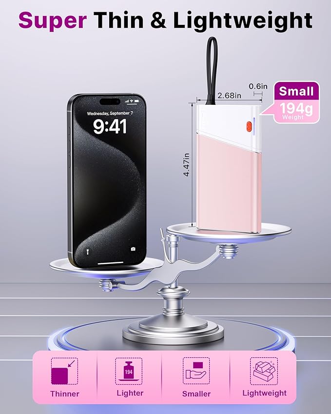 - 10000mAh True Capacity (Lab-Verified) – Real Power, Compact Size--Unlike lightweight power banks that inflate numbers, our lab-verified 10000mAh portable charger delivers honest charging: 2 full charges for iPhone 16/17 or 1.79 charges for Samsung S24. The durable metal construction ensures reliable power in a 0.6-inch ultra-slim body—outlasting 'same-size' plastic competitors by 2X.