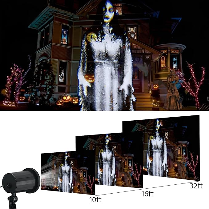 - Clearer and HD Ghost Woman Pattern: this Halloween projector features 4 high-power 1W LED chips for sharp, clear images that cover 323 ft²-538.195 ft²/30-50㎡ (up to 65.6 ft/ 20 m distance), with the effect at 16.4 ft-32.81 ft/5-10m for intense, spooky visuals