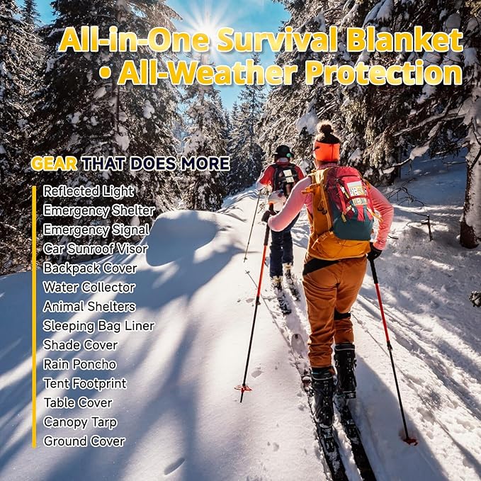 - VERSATILE SURVIVAL SUPPLIES: Serves as a shelter, shield,poncho,shade, ground cover, or emergency signal, enhanced by its oversized, tear-resistant build. Perfect for marathons, wilderness survival, camping, running, hiking, earthquake disaster scenarios or first aid, this reusable emergency blanket ensures long-term reliability, adapting to diverse needs for safety in unpredictable situations