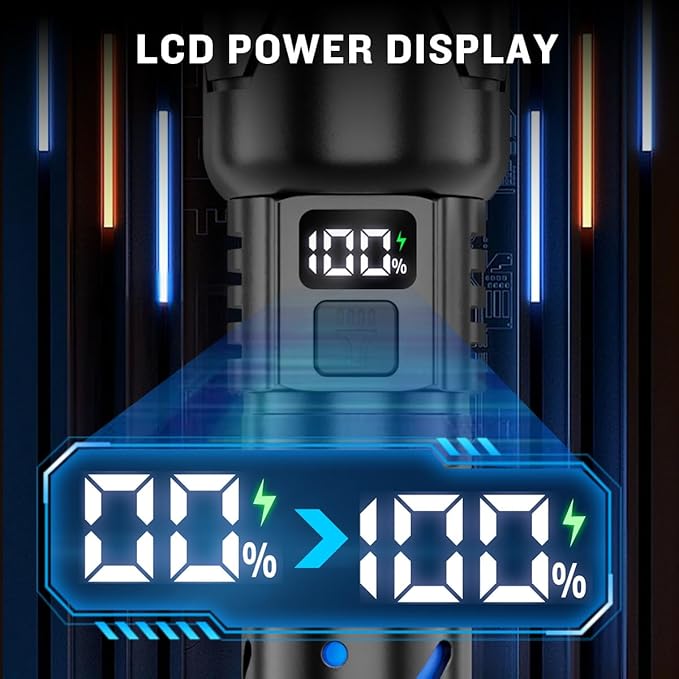 - RECHARGEABLE & POWER DIGITAL DISPLAY: Rechargeable flashlights are very convenient, and the LED rechargeable flashlight features a digital display that shows the power level, ensuring you won't be caught off guard when the power runs out