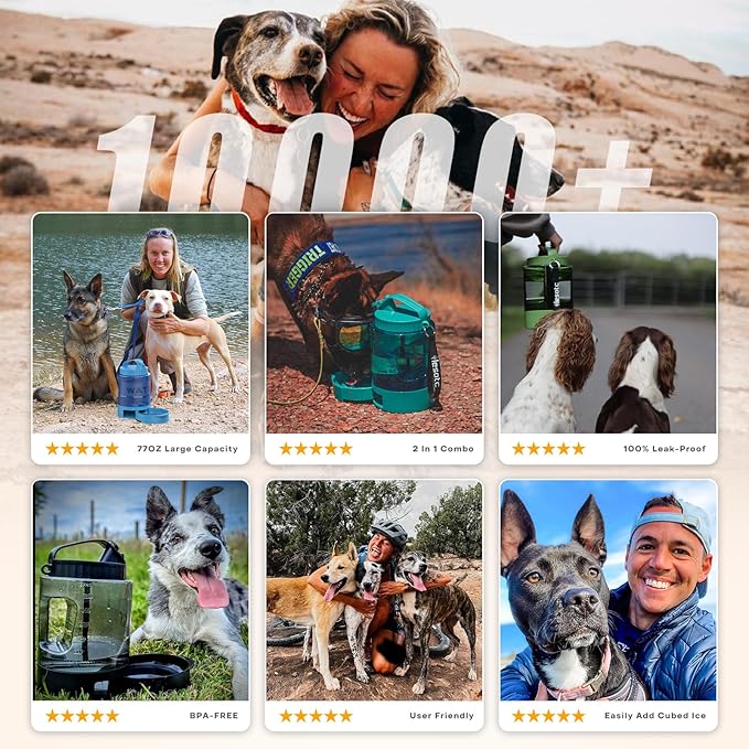- 77 oz Large Capacity Design: With its generous 77 oz capacity, our dog travel water bottle is perfect for a range of adventures, including hiking, walking, beach days, camping, longer car trips, and playful excursions in the dog park and other outdoor activities. Ensure every outing is a breeze for you and your furry friend as our dog water bottle portable keeps your canine companion refreshed on the go, especially in the scorching summer heat