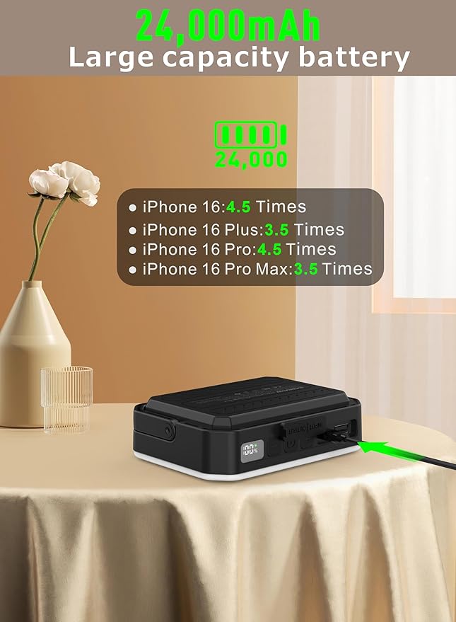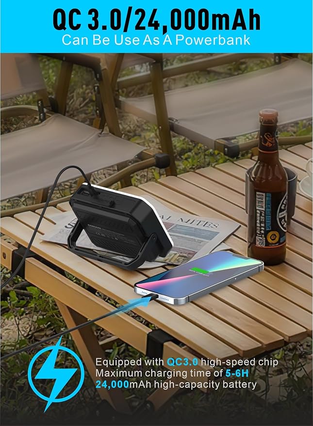 - 24000mAh Fast Charge-This outdoor LED camping lantern is USB - rechargeable. With a 3.7V, 24000mAh battery and a QC3.0 intelligent chip, enabling quick charging for your iPhone. It's extremely practical during outdoor adventures or emergencies. The USB - A and USB - C ports can output up to 22.5W (Max), and it only takes about 5 - 6 hours to fully charge.