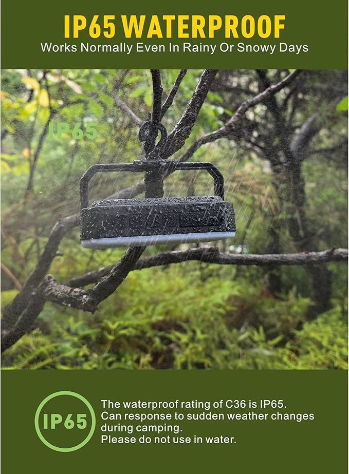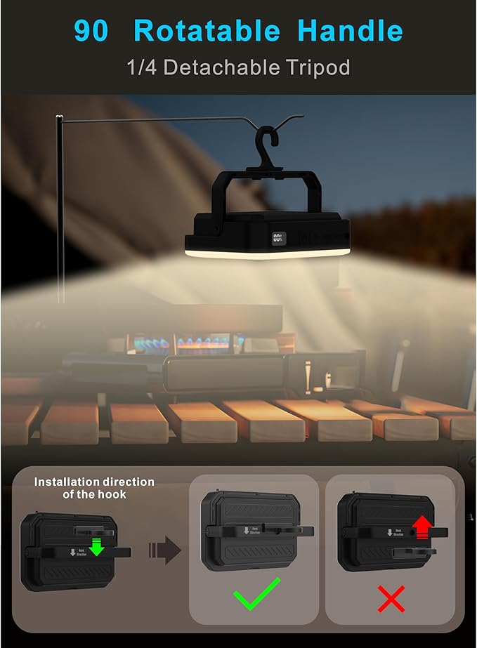 - Digital Display for Brightness & Battery- This tent light comes with a digital display, clearly showing the brightness level from 0 - 100 and the battery level from 0% - 100%. Thanks to its intelligent memory function, it can recall the lighting mode and brightness settings from your previous camping experience.Featuring an integrated hanging hook and 90-degree rotatable stand, this lantern provides full tent illumination at your desired angle.
