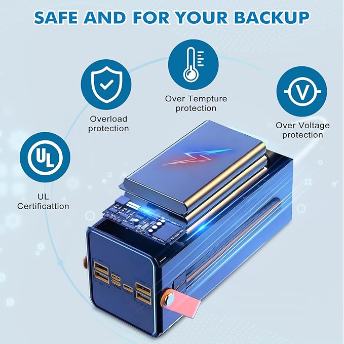 - PGOYB 45,000mAh Power Station - Keep all your devices powered with this high-capacity portable power bank. Featuring built-in USB-C input/output cables for On-The-Go Use, it delivers enough energy to fully recharge most smartphones 12-13 times. Equipped with a comprehensive Multi-Protect safety system that prevents overcharging, short circuits, and other potential risks, making it an essential companion for indoor/outdoor use.