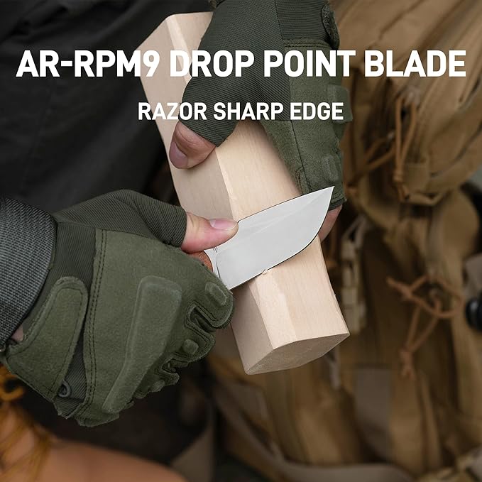 - High-Performance Blade: This fixed blade knife made from 3.18'' AR-RPM9 steel, with a hardness of HRC59-61. The sharp edge, featuring a flat grind and drop point blade style, ensures excellent edge retention and durability. It is sharp and less prone to rust. An ideal camping knife, backpacking knife, fishing knife, hiking knife, or survival knife