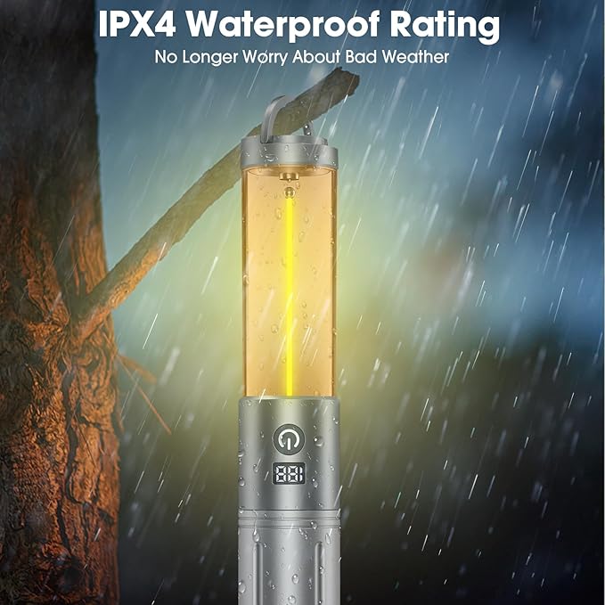 - 【IPX5 Waterproof, Durable Design & Safe Circuit】Waterproof design ensures that this camping lamp can continue to function normally in rain, splashing water and snow. The built-in protection chip intelligently controls the ba-ttery's charge and discharge currents, effectively extending the outdoor tent lantern ba-ttery's lifespan.
