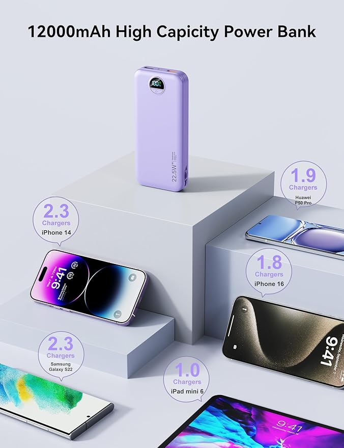 - 【12000mAh High Capicity】12000mAh portable battery can charge for iPhone 15 about 1.8 times, for Samsung Galaxy S22 about 1.8 times, for Huawei P50 Pro 1.9 times, for tablet mini 4 about 1.1 time,power for the whole day. Don't let a low battery interfere with your travel pleasure.