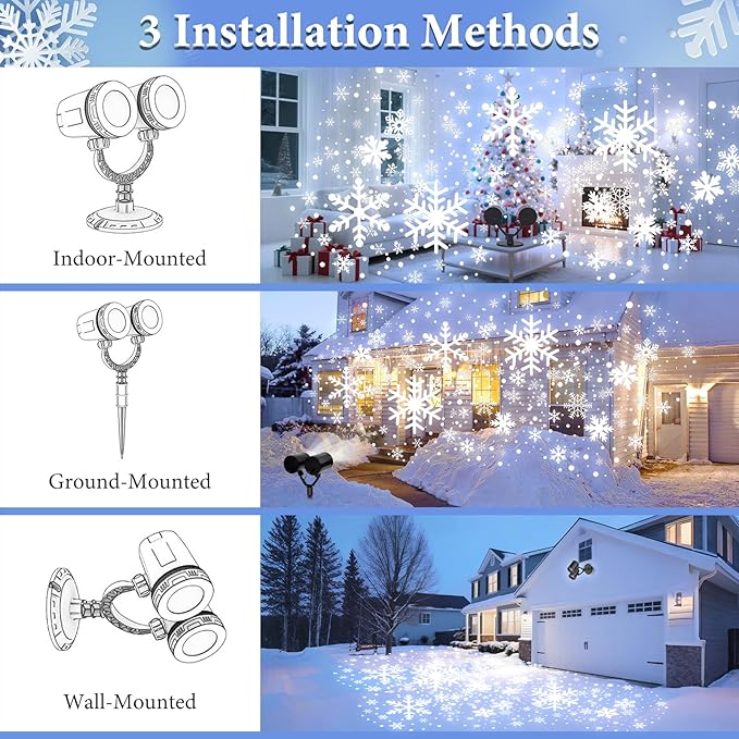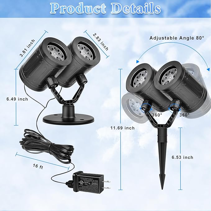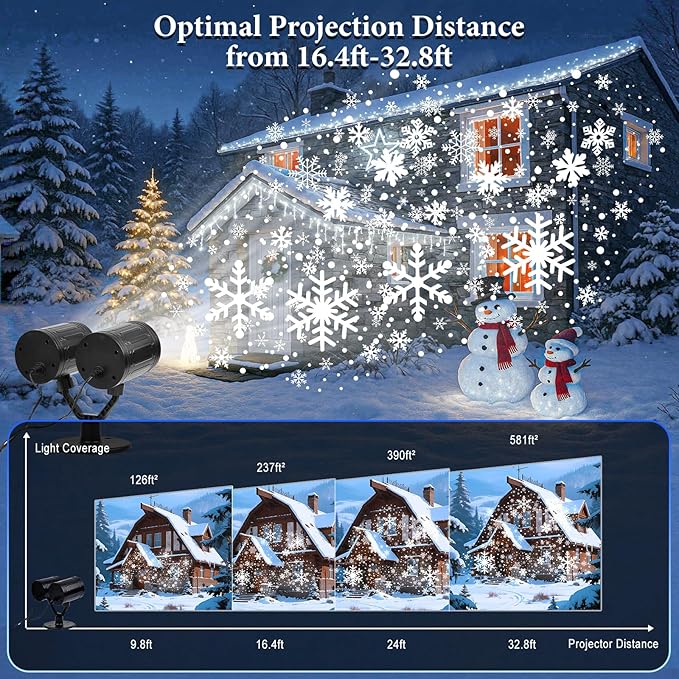 - 【Double Head & 360° Rotation Design】Our snowflake projector feature a dual-head design, which increases the projected area while creating clear and bright snow effects. The light heads can be flexibly adjusted 360° horizontally. You can adjust the appropriate angle according to your needs. To get the best projection quality, place the projector 16.4 ft to 32.8 ft from the surface it projects on.