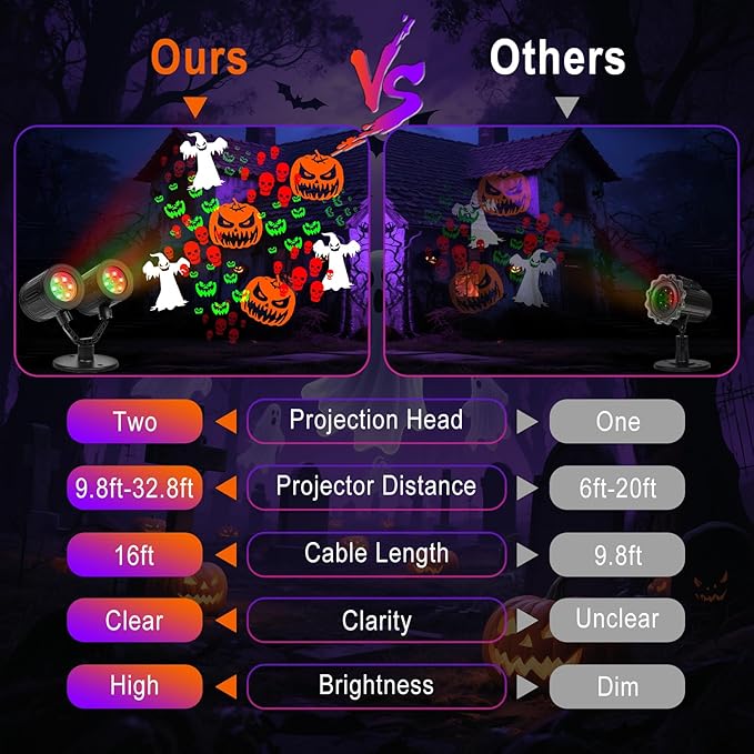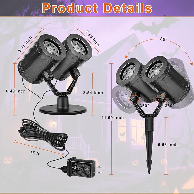- 【Double Head and 360° Horizontal Rotation】Our Halloween lights projector features a dual-head design and 360° horizontal rotation function, which can expand the projector range and create a tense and scary Halloween atmosphere. For optimal image quality, it is recommended to place the projector between 16.4 feet and 32.8 feet away from the projector surface.