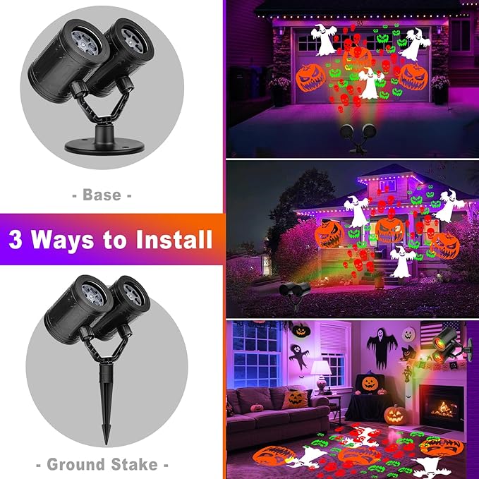 - 【Upgraded Dynamic Halloween Projector Lights】The Halloween lights outdoor feature 4 dynamic Halloween patterns: ghosts, skeletons, devils and pumpkins. Whether indoor and outdoor use, they create vivid and realistic scenes that immerse you in the festive spirit of Halloween. The 16ft extension cord can be easily used in bedroom, wall, window, lawn, patio. Note: Please watch the homepage installation video before installing!