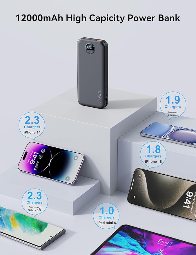 - 【12000mAh High Capicity】12000mAh portable battery can charge for iPhone 15 about 1.8 times, for Samsung Galaxy S22 about 1.8 times, for Huawei P50 Pro 1.9 times, for tablet mini 4 about 1.0 time, power for the whole day. Don't let a low battery interfere with your travel pleasure.