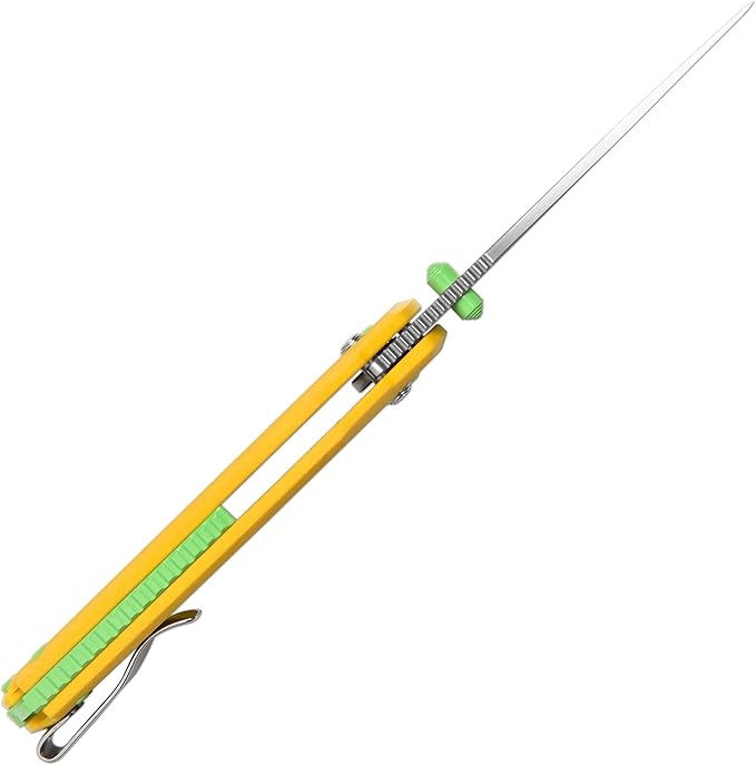 - Bold and Stylish Design: The CJRB Nanner blends bold aesthetics with utility. Its vibrant yellow handle and unique blade shape command attention. The eye-catching green spacer embedded in the middle and green pivot screw not only adds a pop of color to the knife body but also enhances the stability of the knife body. It will catch the eye wherever you go