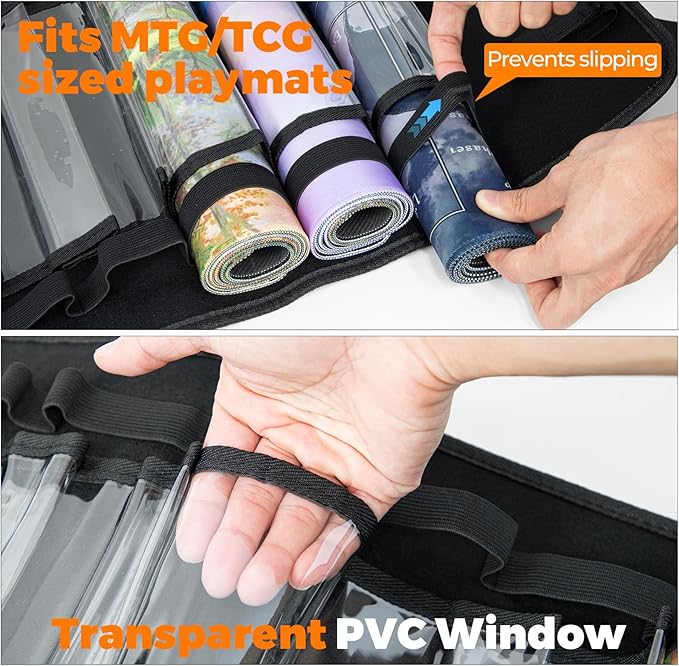 - Instant Playmats Access & Clear Display: Extra-clear plastic slots and a Velcro-secured bottom compartment. Find and grab your favorite mat in seconds without unrolling others. Swap mats mid-tournament faster. Reduced setup time by 60% using this playmat holder for MTG.