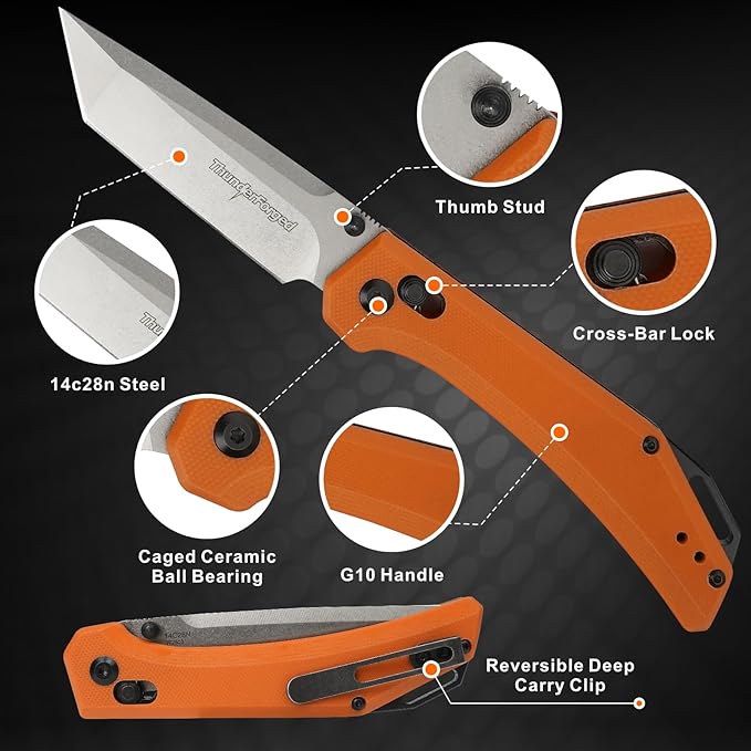 ThundeForged Camping Folding Knife - EDC Folding Knife with Crossbar Lock, 14C28N Steel Blade, Orange G10 Handle Lightweight Tactical Pocket Knife for Camping Outdoor Survival Hiking