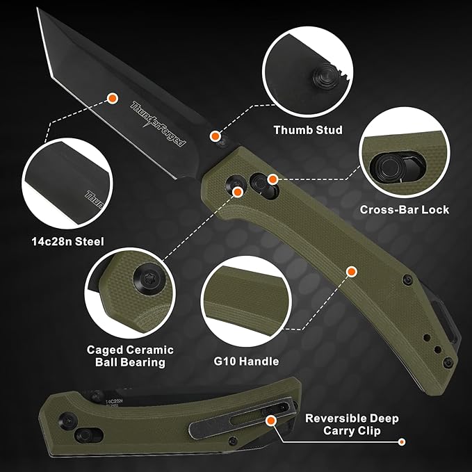 ThundeForged Camping Folding Knife - EDC Folding Knife with Crossbar Lock, 14C28N Steel Blade,Green G10 Handle Lightweight Tactical Pocket Knife for Camping Outdoor Survival Hiking