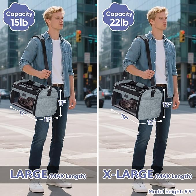 - Check Size First: The pet carrier is collapsible and available in two sizes: L (17"x11"x11", Airline Approved) for pets up to 15 lbs, and XL (19"x12"x12", NOT Airline Approved) for pets up to 22 lbs; Note: Check your airline's size regulations before boarding to ensure compliance; For a proper fit, please reference your pet's length and height rather than relying solely on weight