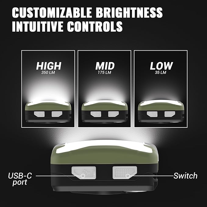 - The lantern features three brightness settings—High (350LM), Medium (175LM), and Low (35LM)—making it adaptable to a wide range of lighting needs. Easily switch brightness levels for different tasks, such as reading in your tent, setting up camp, or providing soft light during quiet nighttime activities.