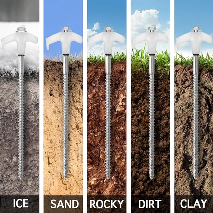 - 【Simple Installation】These screw in tent stakes with pointed tips is easy to insert into the grass, dirt, hard soil, and gravel. The metal threaded tent spikes offer a stronger grip in windy conditions. With the help of a cordless drill or impact driver, ground anchors will make your tents, canopy, awning, tarps, and grasp the ground more stable and reliable.