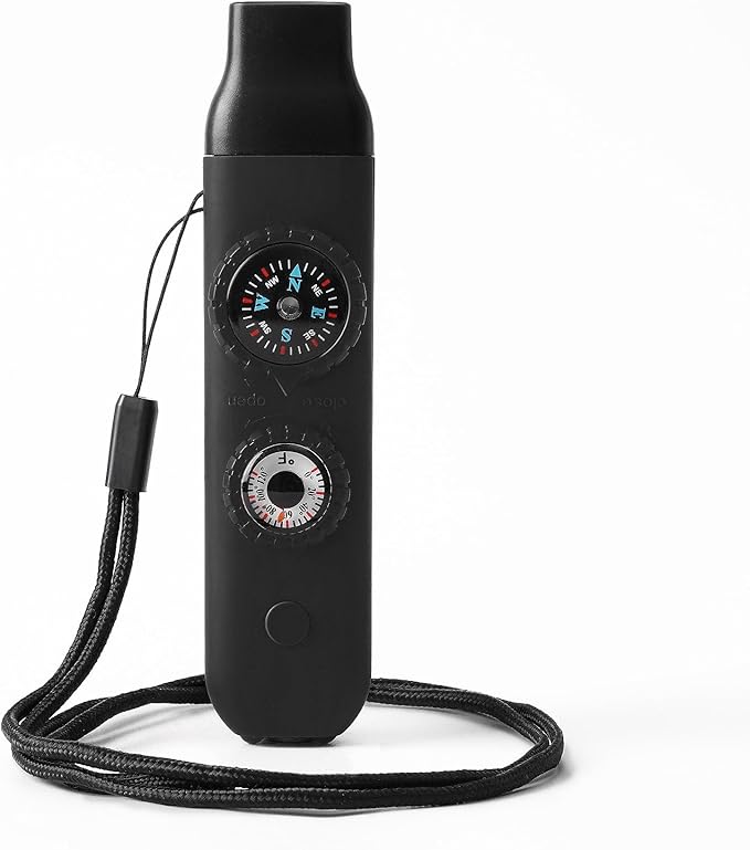 - The 7-in-1 Safety Whistle sets 7 functions including Emergency Whistle, Compass, Thermometer, LED Signal Light, Magnifying Glass, Reflector and Sealed Warehouse with good playability (The uniquely designed miniature built-in storage bin can be used to store important personal information, allowing rescuers to grasp your situation at the first time) (NOTE: If you need help in an emergency, you can try whistling softly, which is louder than whistling at full force)
