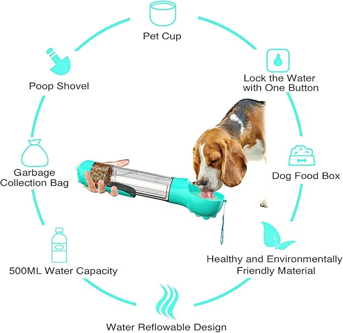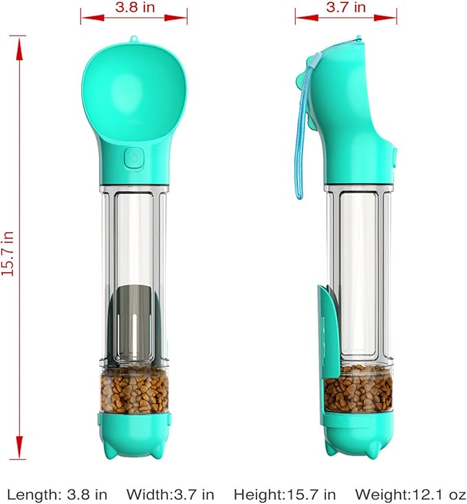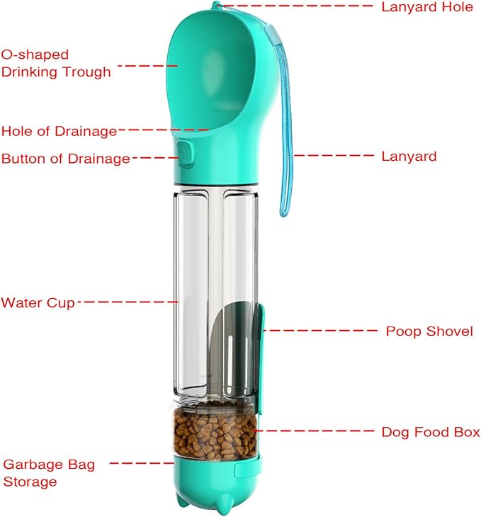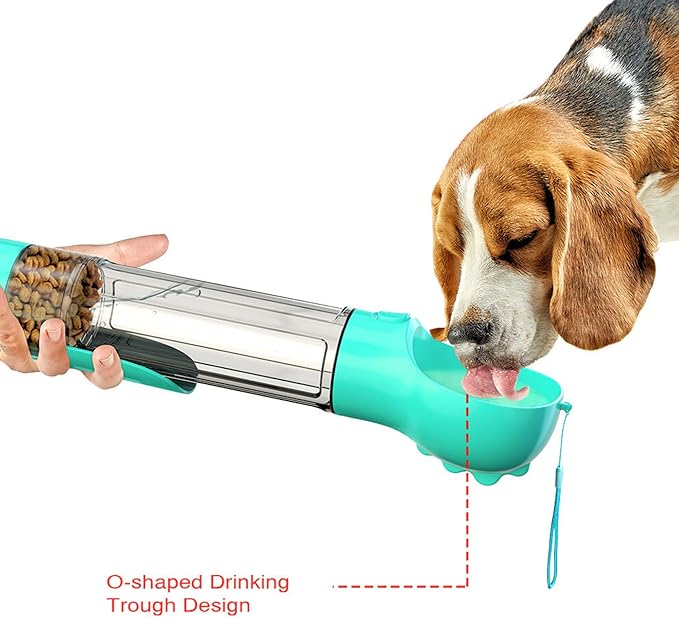 - All-in-One Pet Travel Cup: This 4-in-1 multifunctional water bottle combines a large water cup (O-shaped design matches your dog’s mouth for easy, comfy drinking), dog food container, waste bag dispenser, and built-in bowl. Perfect for walks, hiking, travel, and outdoor adventures—everything your dog needs in one compact design.