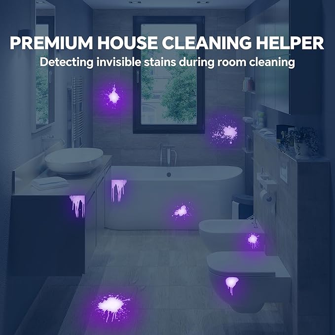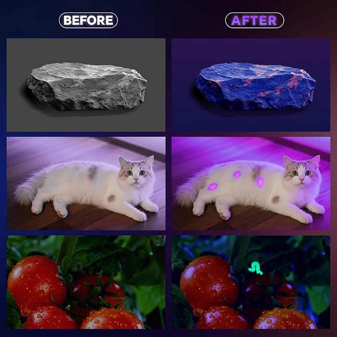 - 【Wide Range of Applications】Outdoor Adventures: Searching for rocks, scorpion hunting, mineral and insect searches;Home Detection: Pet urine inspection, ringworm/bed bug detection, hotel/bathroom/kitchen cleaning, food stains/fluorescent material detection;Professional Uses: UV resin curing, air conditioner leak detection, ID and currency authentication, uranium glass inspection, UV coatings, golf ball searches, etc.