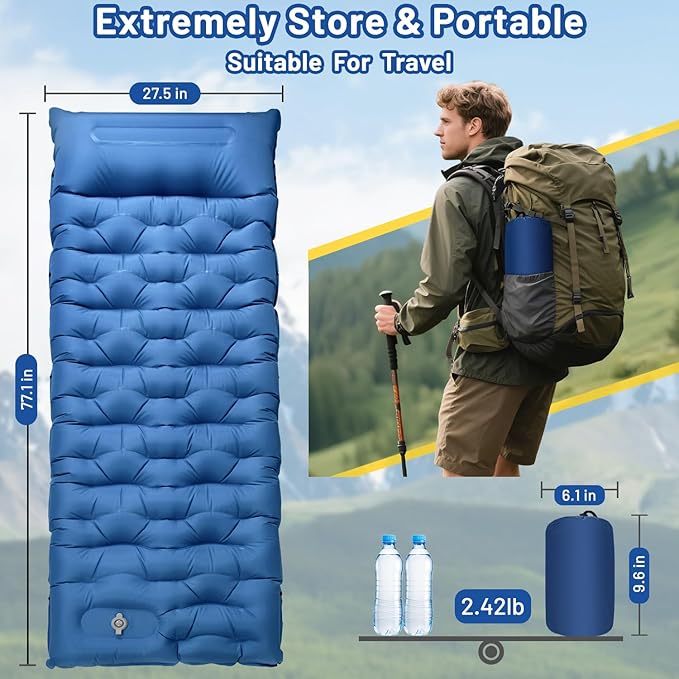 Camping Sleeping Pad, Extra Thick 6 Inch Inflatable Camping Mat with Pillow Built-in Foot Pump Ultralight Portable Sleeping Pads Compact for Hiking Backpacking Travel Tent Car Camp Gear