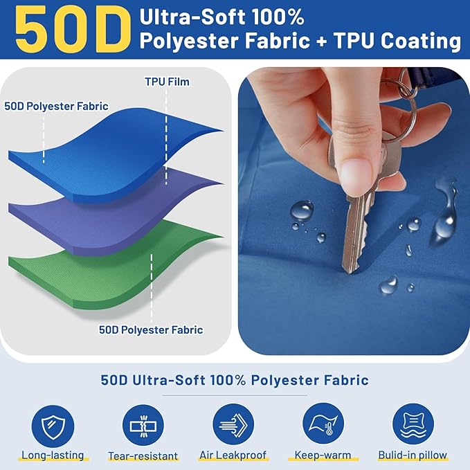 - New Outdoor Upgraded Materials: The ultra durable camping sleeping mat is made of 50D pure polyester fiber and TPU coating, which will not tear or leak even when using keys or thick branches. It has strong wear resistance and puncture resistance. In addition, it is soft, waterproof, noise free, easy to clean, ensuring a peaceful and painless sleep on any terrain, making it the perfect choice for long-distance travel.