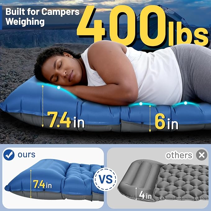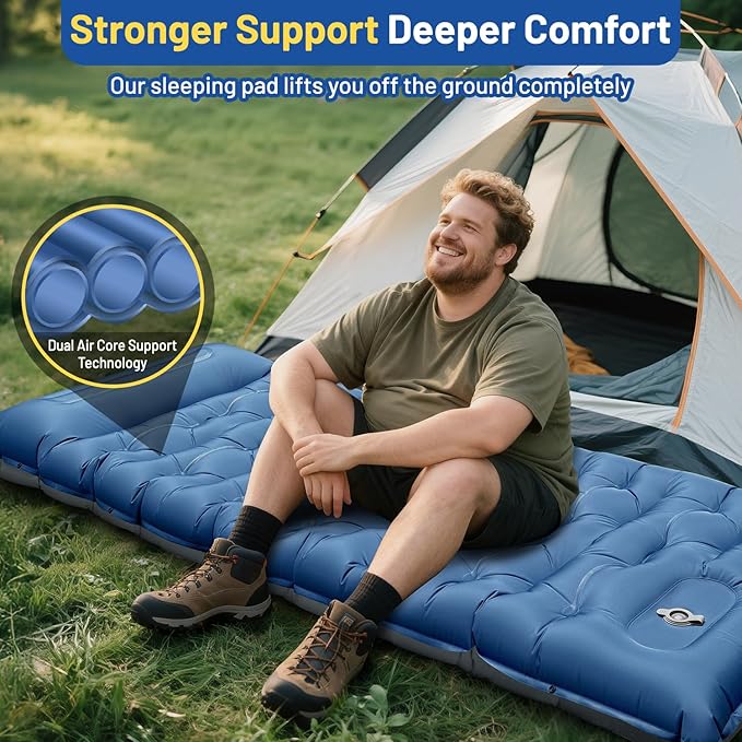 - More Thicker Support, More Comfortable Experience: Our 6-inch thick camping sleeping mat is made of a double-layer structure, which has double the support compared to other ordinary camping mattress pad on the market. This strong support keeps your body away from the ground and provides a more comfortable experience. Innovative water corrugated air tubes and built-in pillows can relieve pressure on the back and neck, ensuring maximum comfort and warmth throughout the night regardless of the sleeping position.