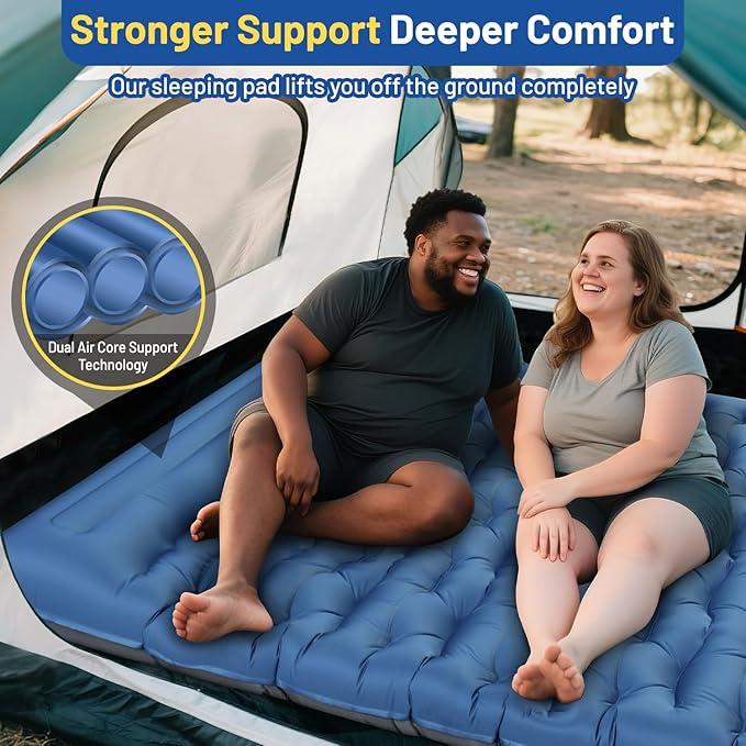 - 【Extra Thick 6" Double Sleeping Pad】:Our 2 person sleeping mat is 6 inches thick and 55.5 inches wide, much thicker and wider than other camping sleeping mats on the market, enough for 2 people to use. Also, it has strong support to keep you away from uneven ground and hard rocks. Innovative water ripple air cells and built-in pillows can relieve pressure on the back and neck, ensuring maximum comfort and warmth throughout the night regardless of the sleeping position.