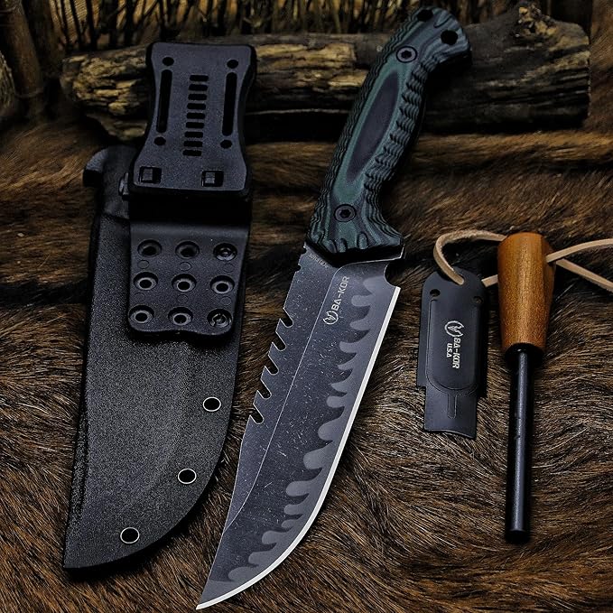 BA-KOR 12.4in Full Tang Fixed Blade Hunting Knife ??6mm 9CR18MoV Steel, G10 Handle, Stonewashed Sawback Blade with Kydex Sheath & Fire Starter for Outdoor, Camping, Survival (Green and black stripes)
