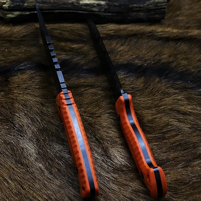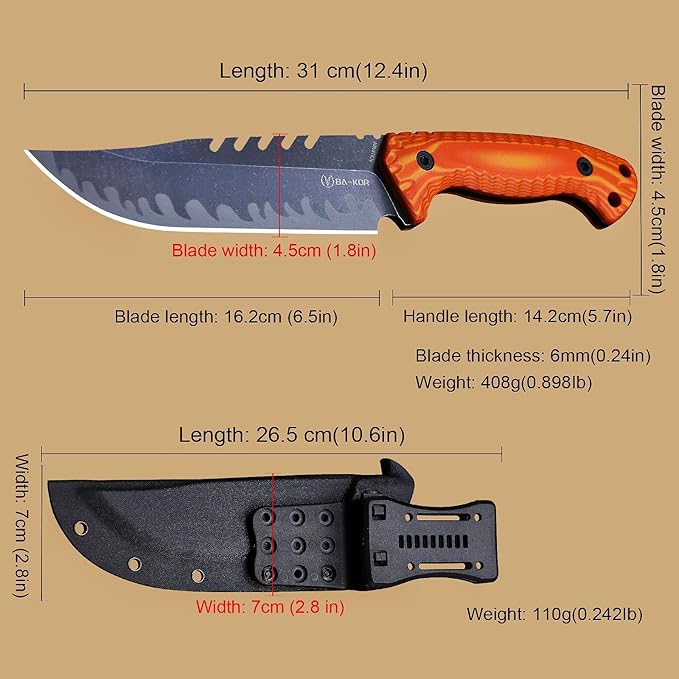 BA-KOR 12.4in Full Tang Fixed Blade Hunting Knife ??6mm 9CR18MoV Steel, G10 Handle, Stonewashed Sawback Blade with Kydex Sheath & Fire Starter for Outdoor, Camping, Survival (Orange with light yellow stripes)