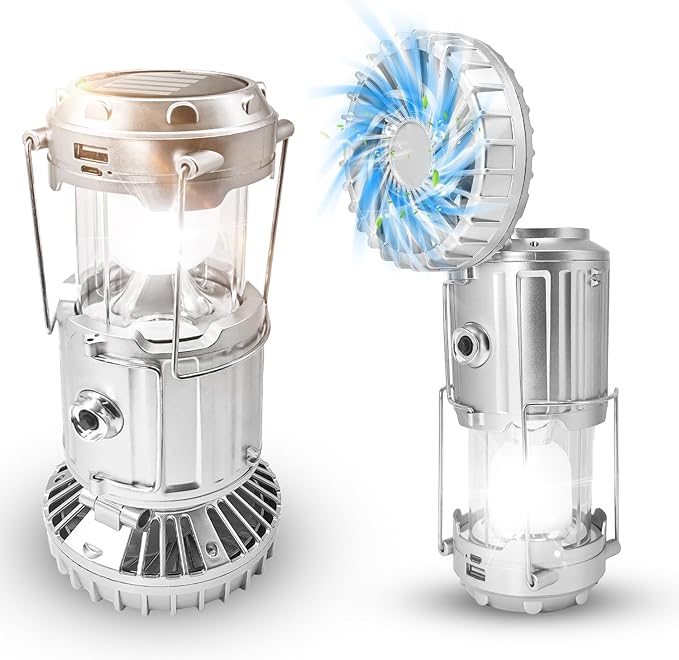 Solar Camping Lantern with Fan, Collapsible USB Rechargeable & Battery Powered Emergency Hanging Lights for Camping Tent Hurricanes Power Outages Storm Indoor Outdoor (Upgraded, 1 Pack)