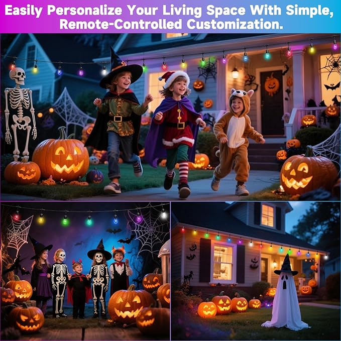 - Custom Ambiance :Create a warmer ambiance by connecting up to RGB light strings together (recommendation: connect up to 2 light strings). From lively parties to romantic weddings, BOKELUNA outdoor RGB string lights enhance decks, porches, patios, gardens, backyards, terraces, pergolas, cafes, markets, and more, adding elegance and versatility to any setting.(Includes remote control - 15 adjustable RGB light string modes-Outdoor string lights perfect for Halloween Christmas weekend parties and weddings)