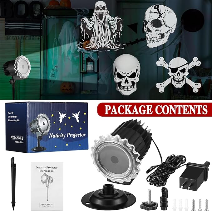 - Extended Package for Added Convenience: we offer a comprehensive package that includes 1 halloween ghost Projector Light, 1 us plug, 1 round base, 1 stake, 1 mounting screw kit, 1 manual; No need for additional purchases; Our package provides everything you need to set up your nice holiday projector lights outdoor