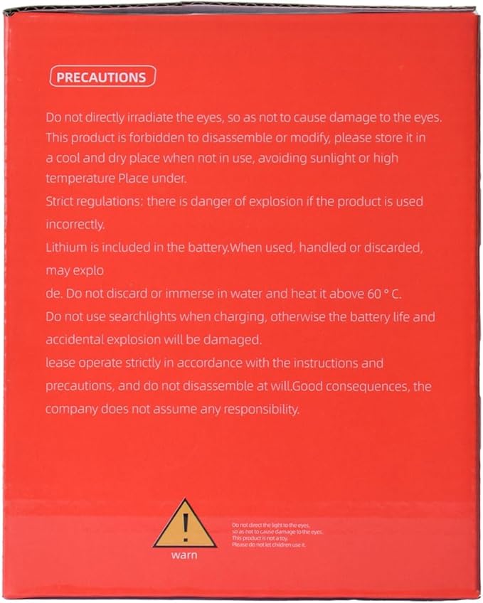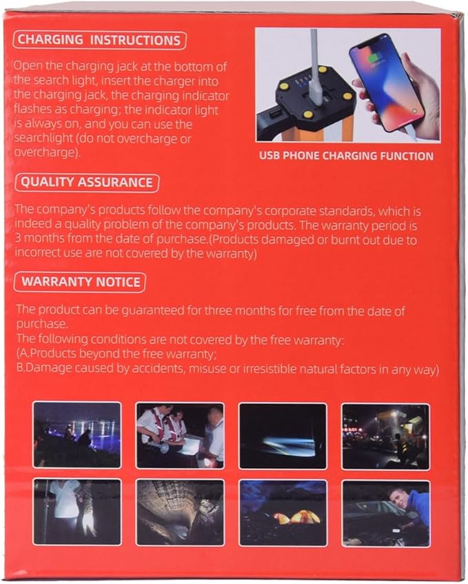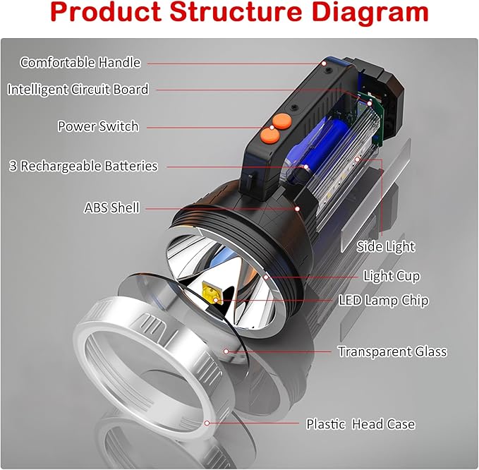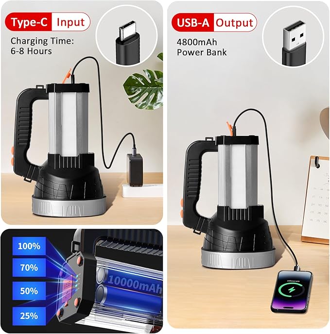 - Rechargeable LED Flashlight: LED searchlight with a total battery capacity of up to 4800mAh, replacement battery not required, working time is 10 hours, charged by USB port, and it takes 6-8 hours to be completed.