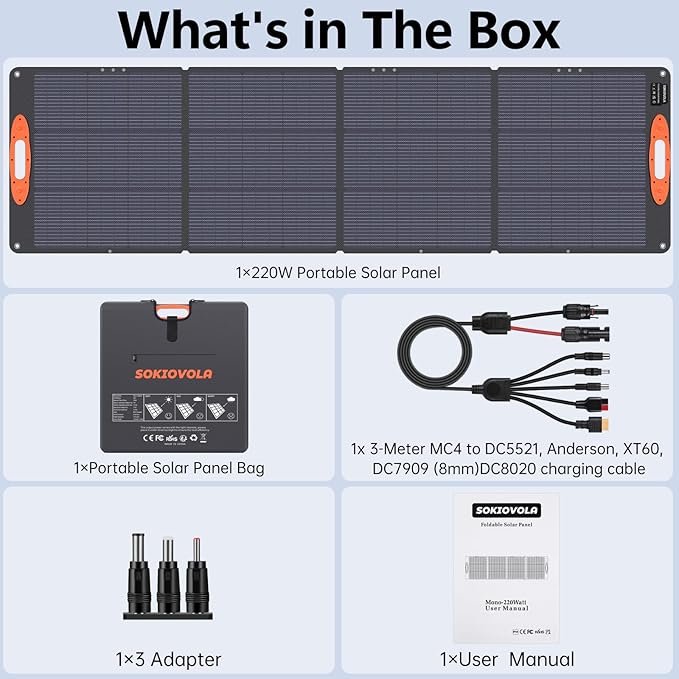 - 【Package and Support】1x SOKIOVOLA 220W Portable Solar Panel ,1x10.49ft 5-in-1 solar extension cable(solar to XT60,5521,Anderson,DC7909 (8mm),DC8020mm) Charging Cable,1x3 Adapter,1x user manual ,We also offer an 24-month warranty and a 30-day refund guarantee from the date of purchase. If you encounter any problems during use, please contact us and we will respond within 12 hours.