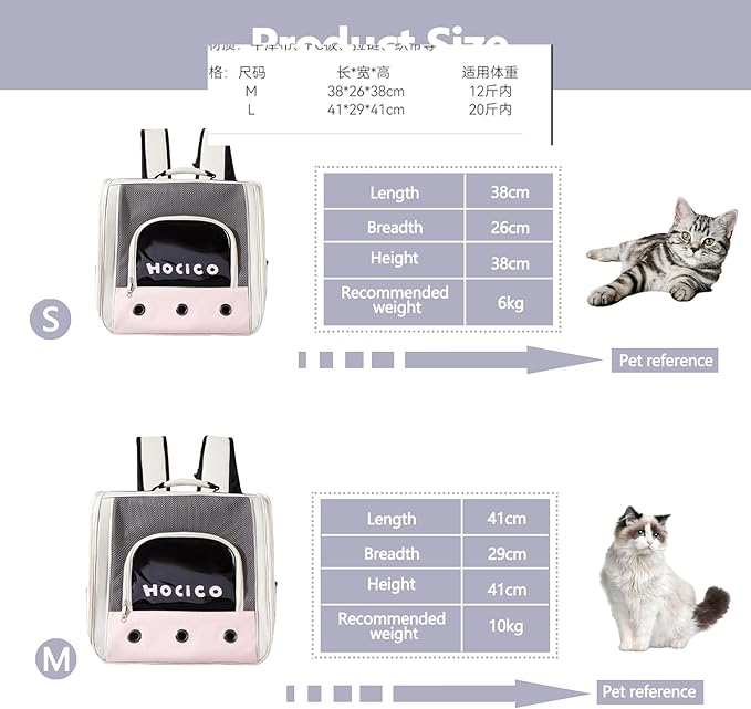 - Size: There are two sizes of pet backpacks to choose from. S: 38*26*38 cm, suitable for pets weighing less than 6 kg. M: 41*29*41 cm, suitable for pets weighing less than 10 kg. The cat backpack has a larger and more spacious interior space than ordinary pet backpacks, allowing pets to lie comfortably inside and change postures freely.