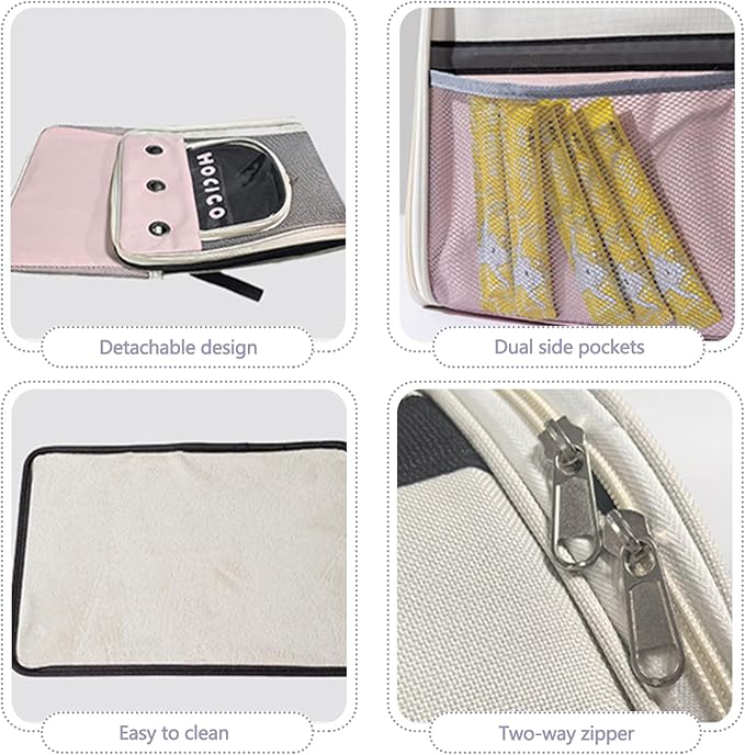 - Multiple ways to carry: This pet backpack can be carried by hand to ensure balance when carrying. It can also be carried on the shoulders. Zipper openings are set up on the front and sides for easy access for cats, and convenient for owners to feed and pet. The side pocket design is convenient for storing personal belongings.