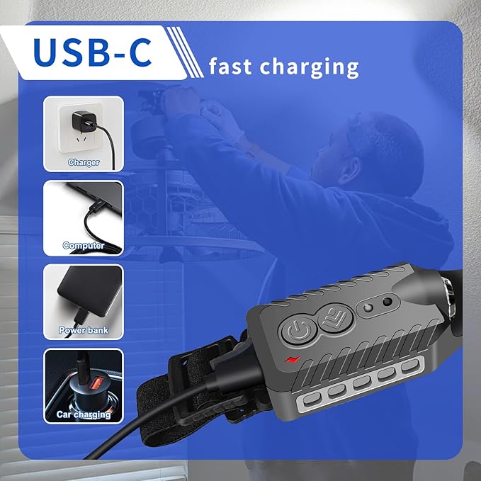 - Type-C USB Charging & Extended Battery Life: Stay powered up with our Type-C USB rechargeable headlamp, delivering long-lasting battery life that can last an entire workday of up to 8 hours. Quick and convenient charging ensures you're always ready to go, making it an excellent choice for all-day tasks and outdoor activities.