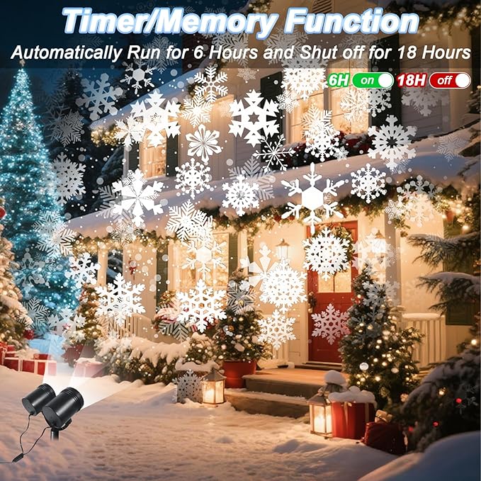 - 【Auto Timer Function Saves Energy】Easy to use and save on energy costs with long-lasting, low-power LED snowflake lights that provide brilliant snowflake moving effects. Simply plug in the adapter and press the button—when the button turns green, the projector light will automatically run for 6 hours and shut off for 18 hours, reducing power usage while maintaining holiday brilliance.