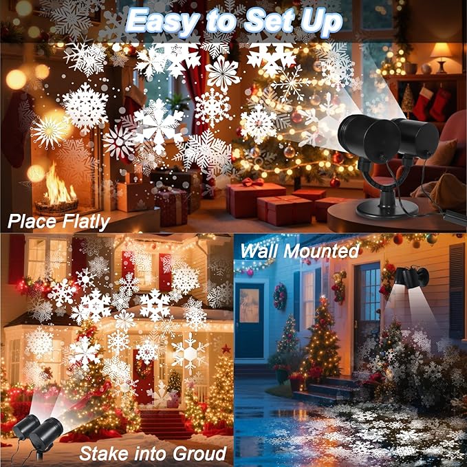 - 【360° Adjustable Winter Magic & Easy Setup】Adjust the 360° projection angle up or down for perfect coverage. With a projection distance of 16ft-36ft, it illuminates areas up to 235-521 sq ft. You can use 3 easy ways to install the Christmas projection lights: place it on a table, stake it into the ground or mounted on wall. It delivers a smooth, dynamic snowflake pattern at an ideal speed and ensures stress-free Christmas decorating.